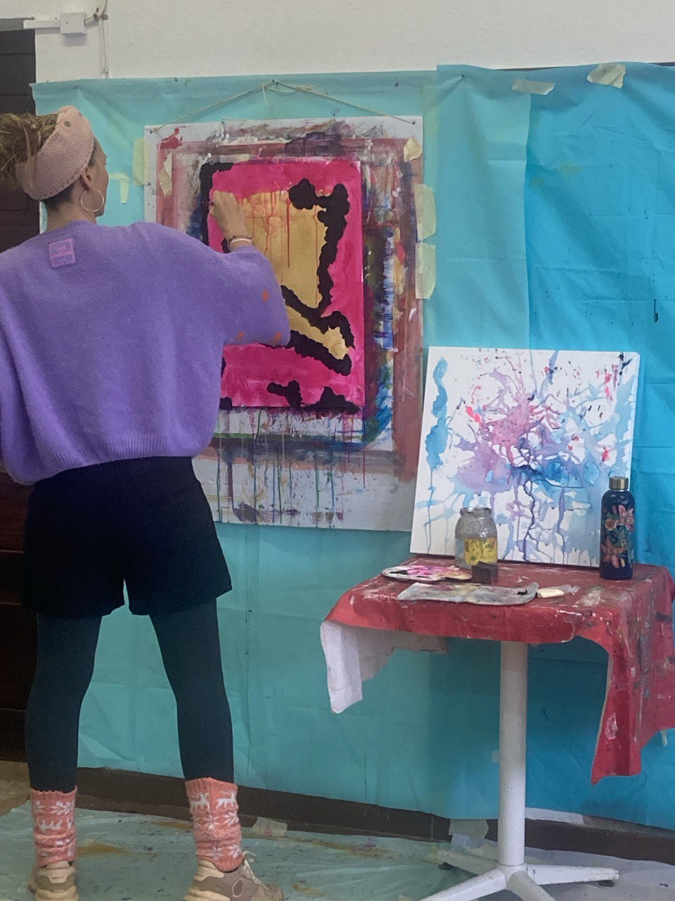 In Paintflow, we paint with acrylic paint and brushes, spatulas and sponges on paper attached to the wall. The focus is on the present moment and getting into the flow. In a trusting atmosphere, you playfully immerse yourself in colors and shapes.