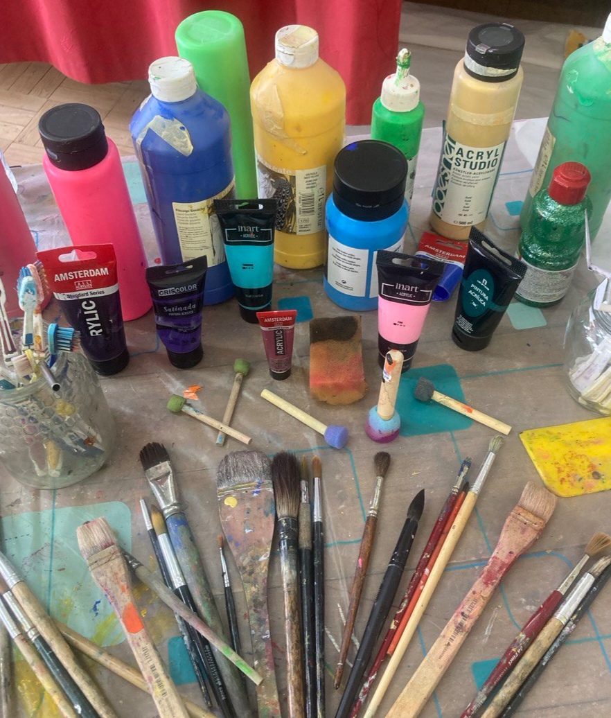 We paint standing with acrylic paint and brushes, sponges and spatulas on paper on the wall. The focus is on experiencing the moment and getting into a flow. In a trustworthy atmosphere, you engage playfully with colors and shapes.